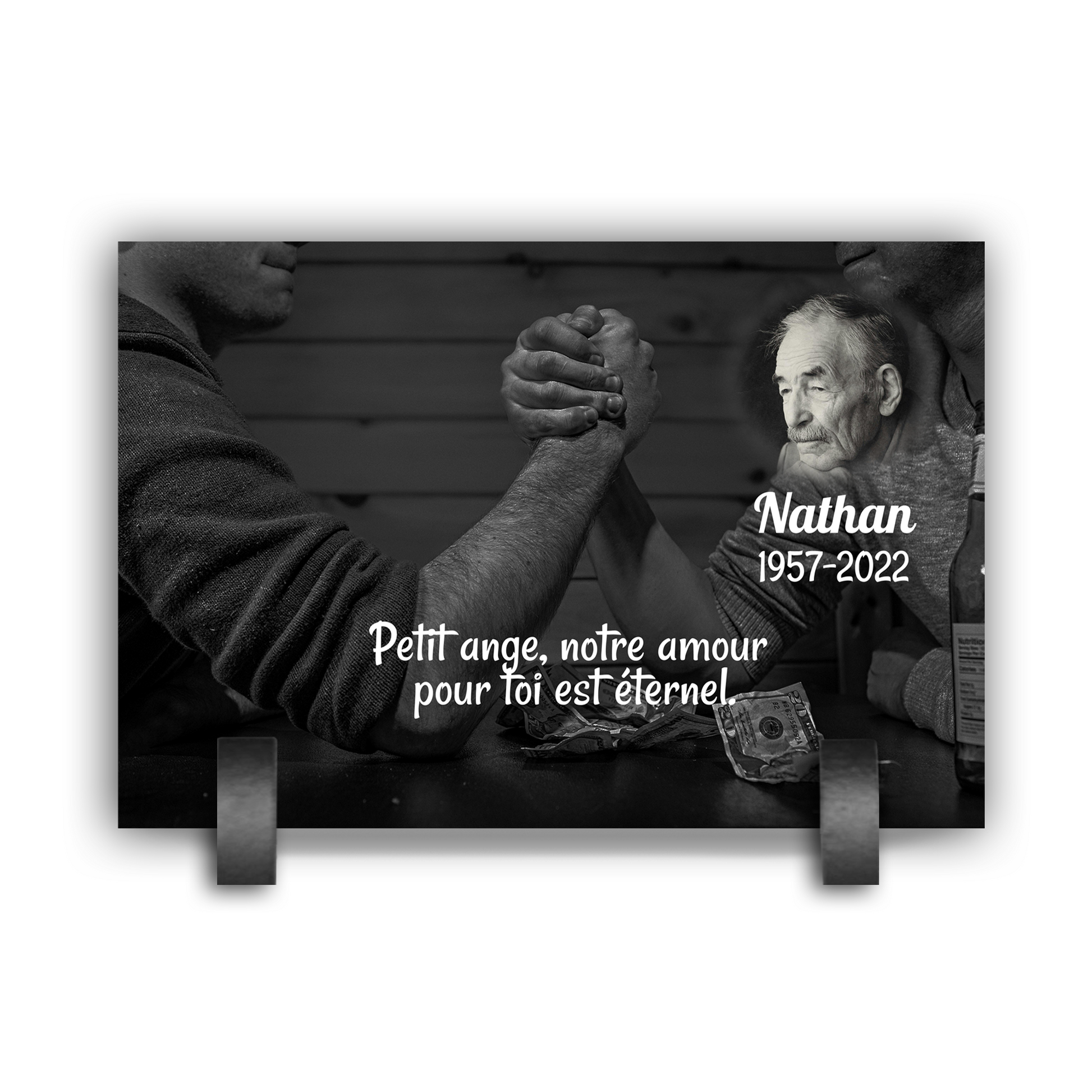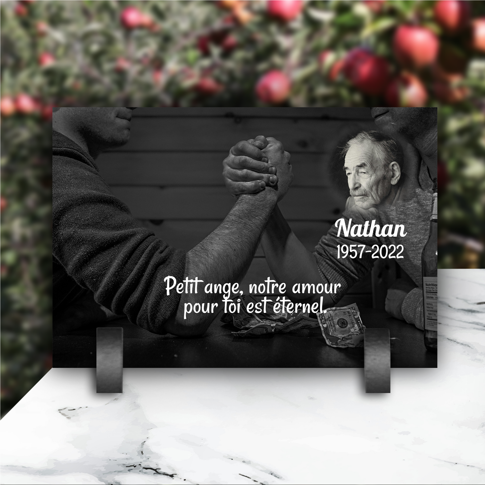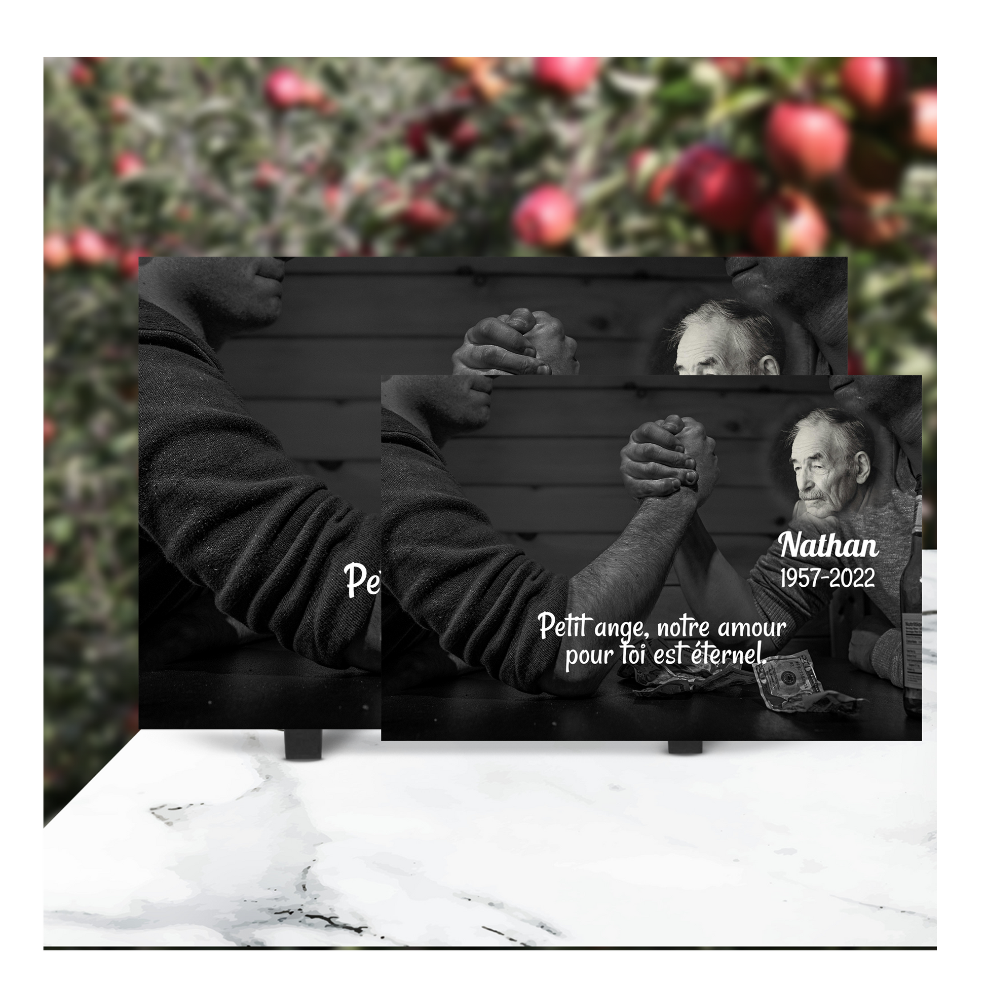 Absolument. Vous pouvez choisir la forme, ajouter un texte (nom, dates, message), intégrer une ou plusieurs photos, et même sélectionner le type de fixation.