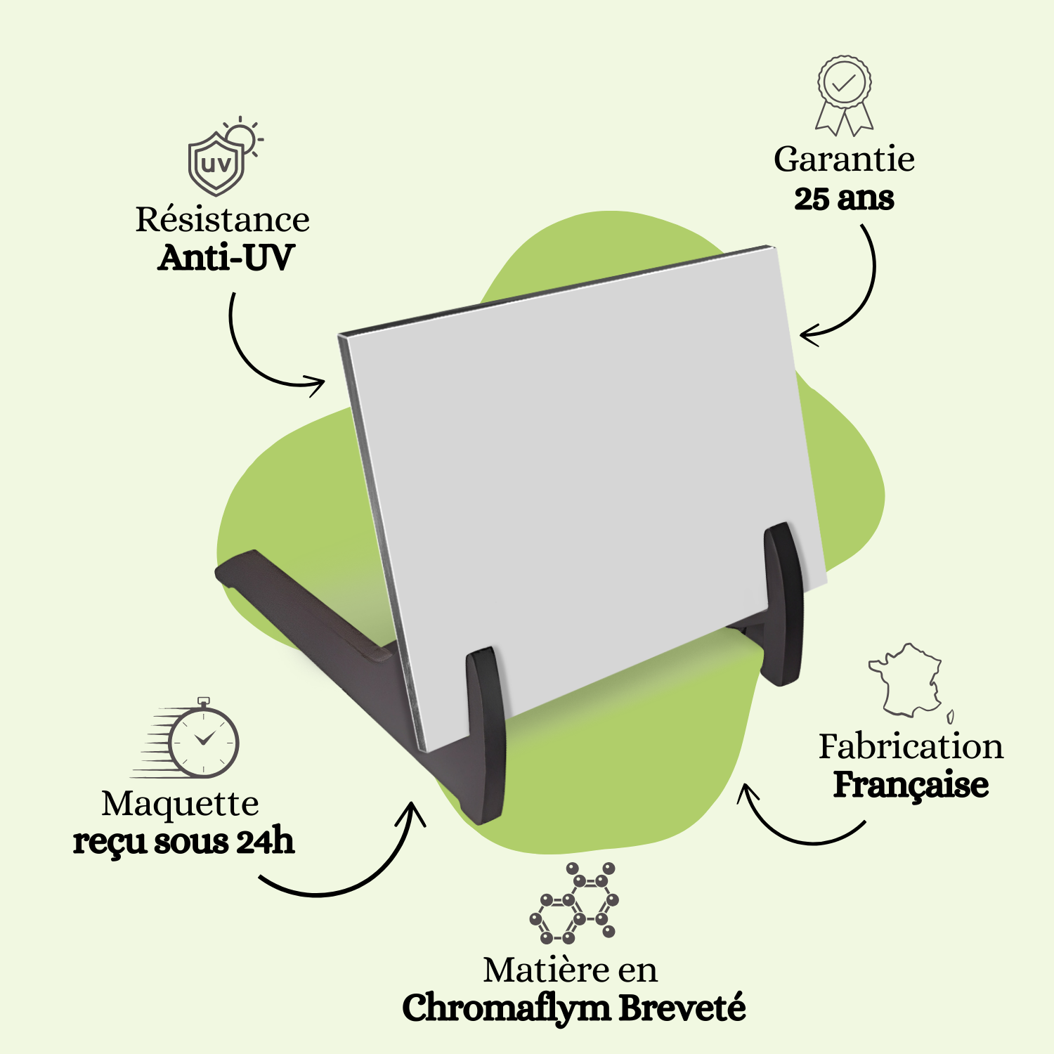 Oui, nos plaques sont fabriquées en Chromaflym®, un matériau exclusif et ultra résistant aux UV, à la pluie, au gel et aux chocs. Elles sont garanties 25 ans.